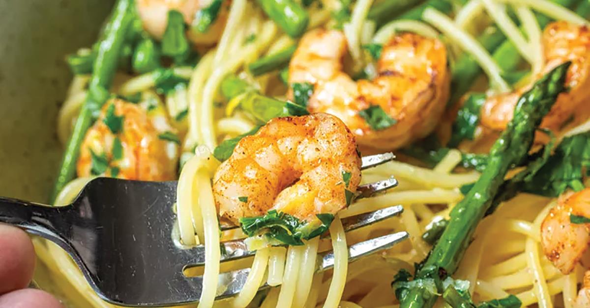 Serve asparagus and prawn over thin spaghetti with the remaining garlic butter sauce and fresh parsley.