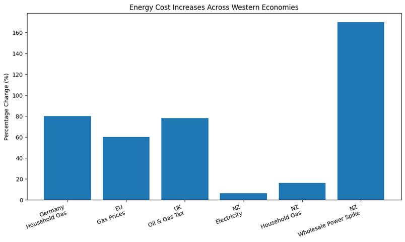 Germany’s “80% higher” household gas price is not a marginal change. The EU’s record gas pricing—driven in part by taxes and scaled-back relief—shows policy can be the price. The UK’s 78% tax environment shows how domestic production can be made less attractive, accelerating decline. New Zealand’s refinery closure shows how resilience can be traded for dependency.