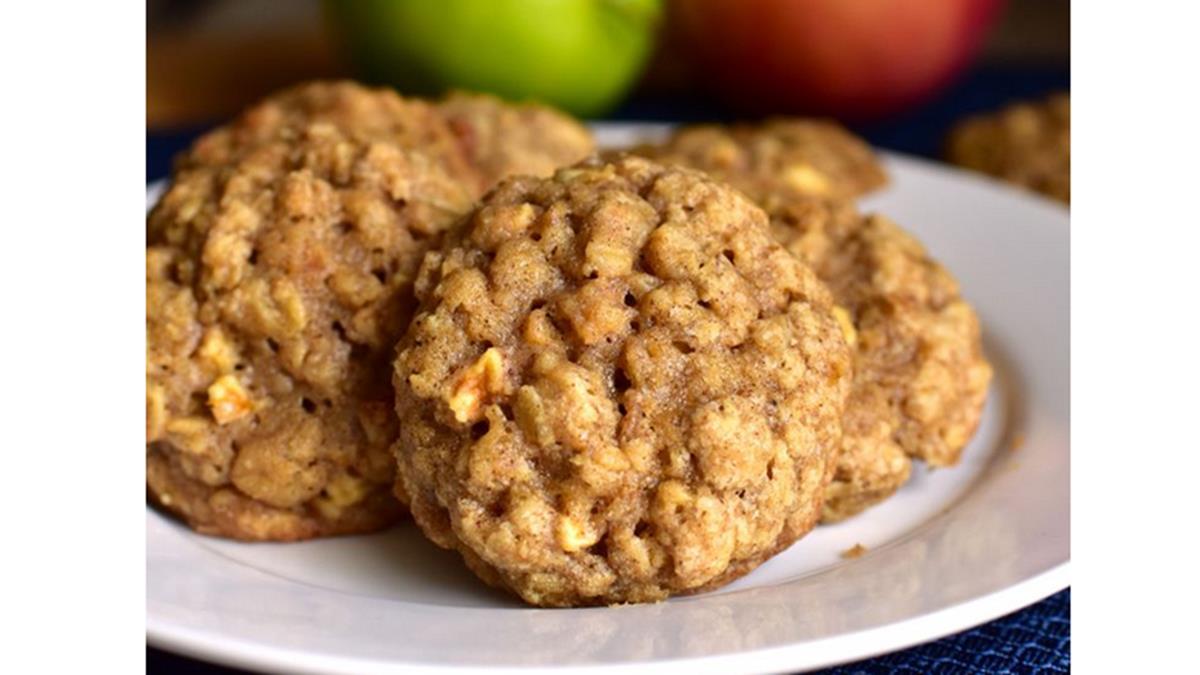 These cookies are incredible easy to make and bursting with apple. They have a lovely cake-like texture with slightly crisp edges - ideal for dunking into a cup of tea. This recipe is quick and fun, and great to get children involved in cooking. Ingredients: - 125g plain flour - 1 ½ tsp ground cinnamon - ½ tsp bicarbonate of soda - ¼ tsp salt - 175g porridge oats - 100g unsalted butter, softened - 150g caster sugar - 1 egg - 4-8 tbsp milk -…
