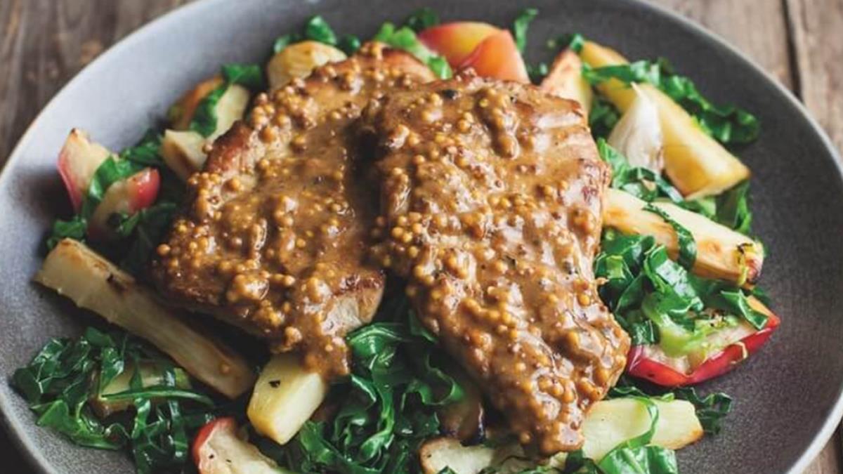 Lemon and mustard pork escalopes accompanied by parsnips roasted with apples and greens. Escalopes are cuts of lean meat, beaten flat for swift cooking. Fry them in a very hot pan; they don't take long and you want as much colour on them as possible, it adds to the flavour. The swiftest way to shred any leafy greens is to stack the leaves on top of each other and roll them into a tight cigar shape. Then slice them widthways, as finely as you…
